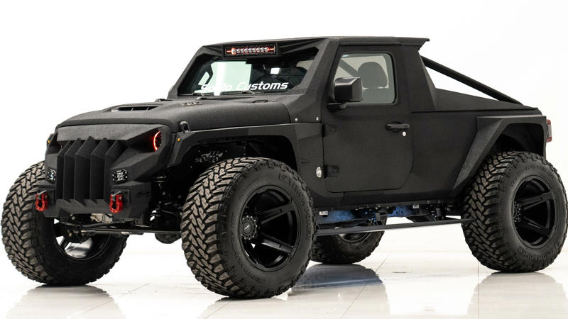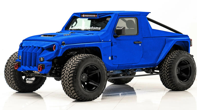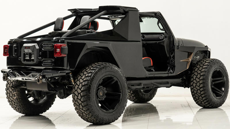 The Speedster is powered by a 6.4-liter Hemi V8, pumping out an almighty 575 hp, or 105 hp more than the Rubicon 392 offers. These gains have been achieved thanks to an upgraded exhaust and a tune. SoFlo has then cut the cabin in half, eliminating the rear section and the rear doors, turning this into a two-door with a five-foot bed at the rear and a custom steel roll cage.