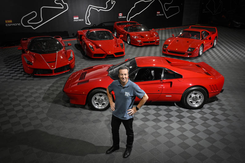 Collector Luc Poirier in his 20,000 square-foot climate-controlled garage for his 42 Ferraris.