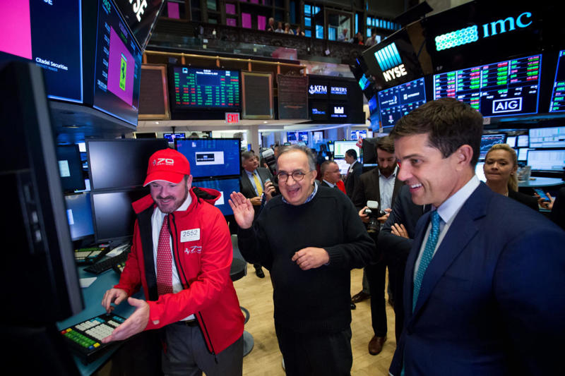 The late Sergio Marchionne, then-CEO of Ferrari, center, on the floor of the NYSE in 2017, liked to compare Ferrari to Hermès.
