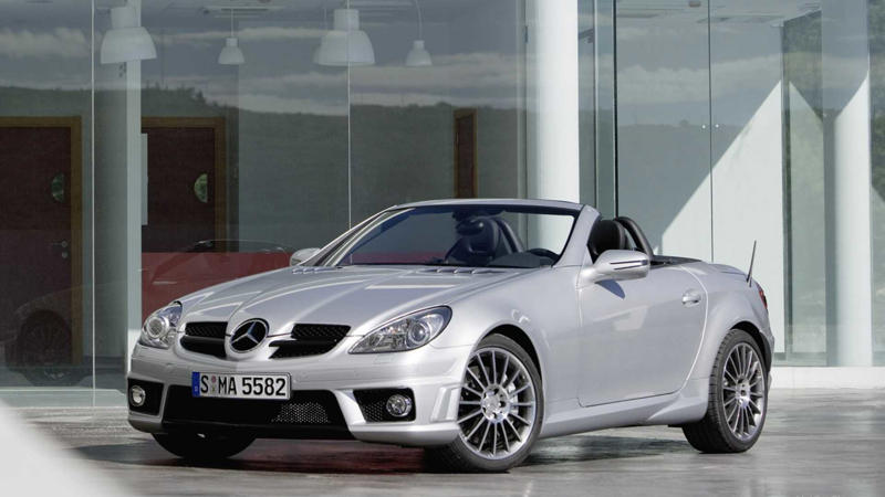 2008 Mercedes-Benz SLK 55 AMG Silver Roof Down Front Angle