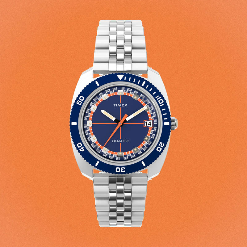 Combined with the ideally proportioned 36mm stainless steel case, the new bracelet amplifies the 1971 Velocity’s retro swagger. It also blends perfectly with the blue and orange dial, making it one of the best daily watches in Timex’s catalog.