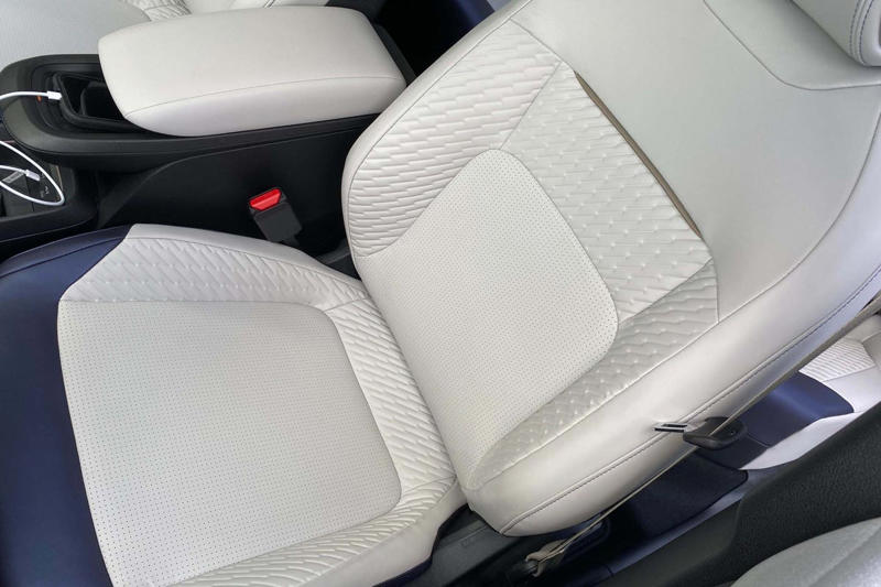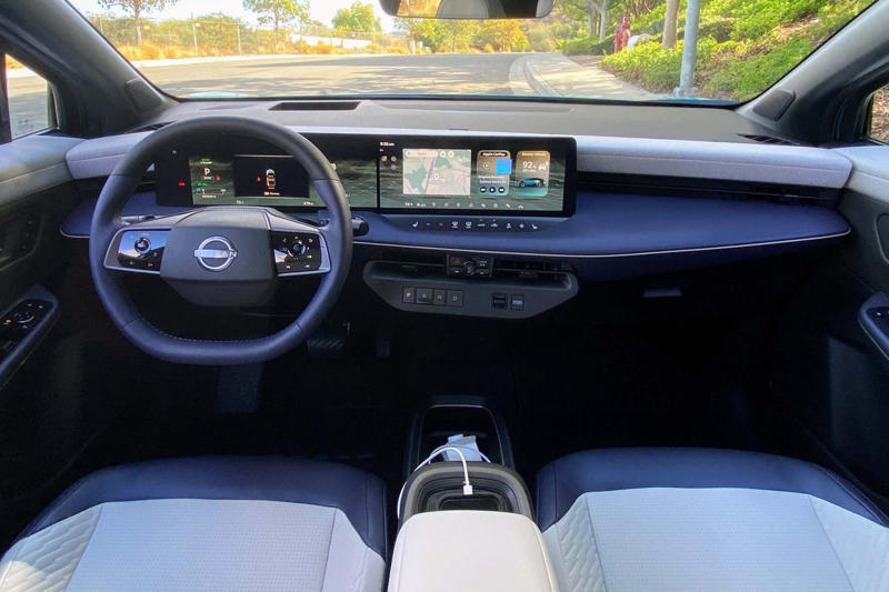 A shelf-like instrument panel and two-spoke steering wheel are similar to what you find in the Ariya.