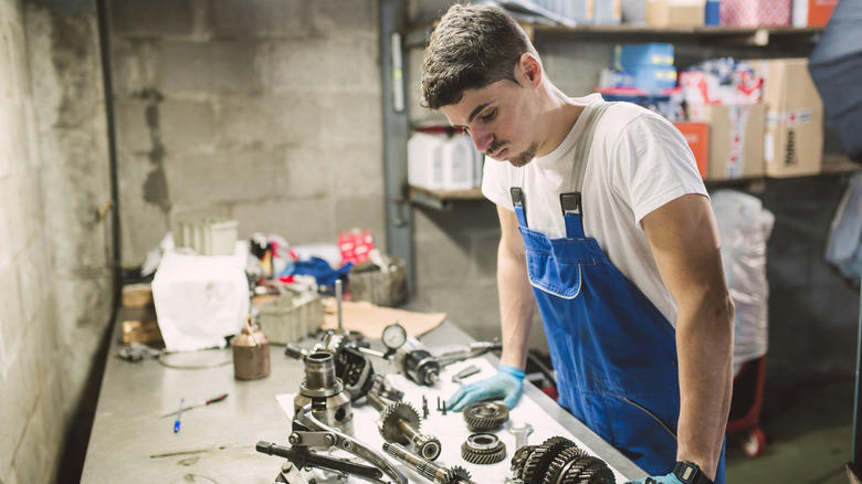 Person reviews mechanical parts on table