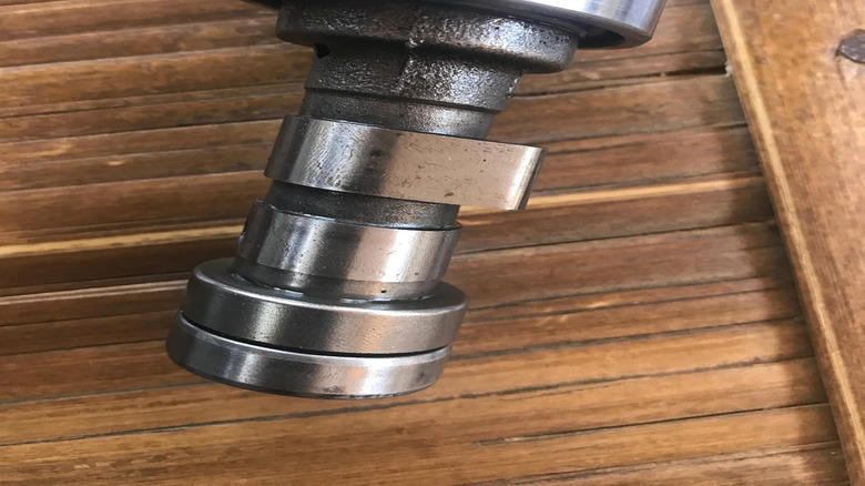 A vehicle camshaft on a surface