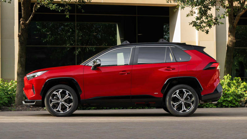 Side profile shot of a red 2025 Toyota RAV4 Plug-in Hybrid