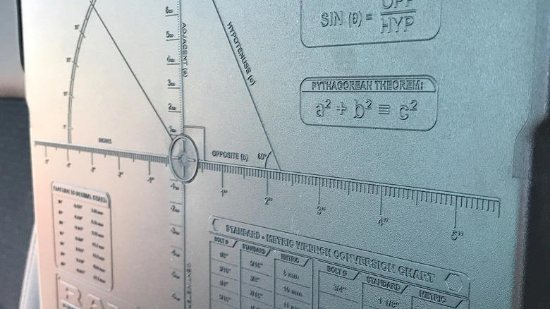 What's under the center console lid of a Ram truck looks like something straight out of a geometry textbook. The markings include a protractor, a right-angle ruler, and a decimal-to-fraction conversion chart. They even incorporate the Pythagorean theorem — the classic math formula for calculating the sides of a right triangle (a² + b² = c²). There are also various rulers and measurement conversions.