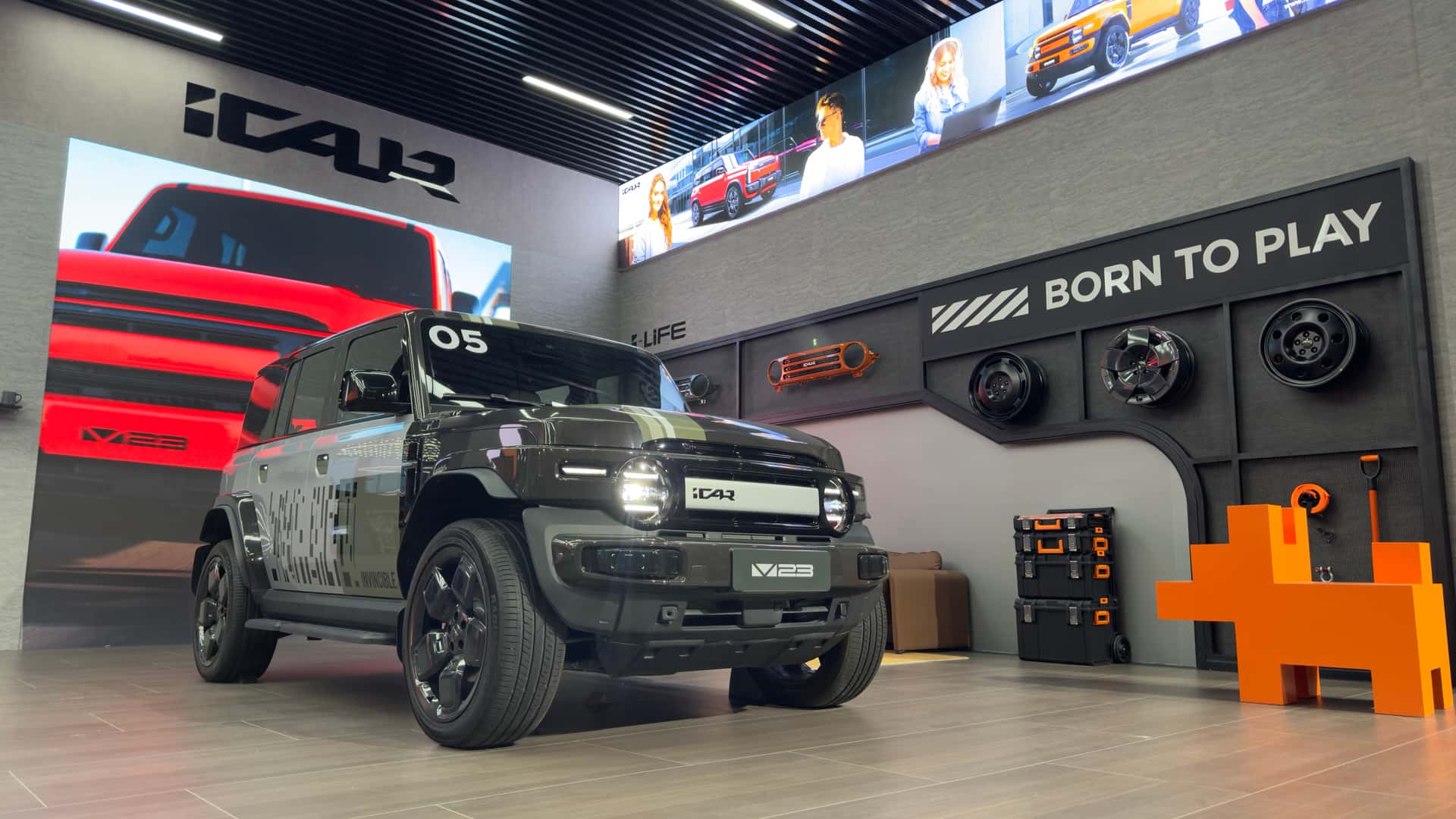 Le Super V23 est la version la plus puissante de la gamme iCar V23. Il conserve le style rétro carré caractéristique, rehaussé par des détails exclusifs tels que les logos "S" rouges sur la carrosserie et les jantes de 21 pouces. Avec une longueur de 4,22 mètres et un empattement de 2,73 mètres, il présente un angle d'approche de 43° et un angle de sortie de 41°, tandis que la profondeur d'embarquement atteint 60 centimètres.