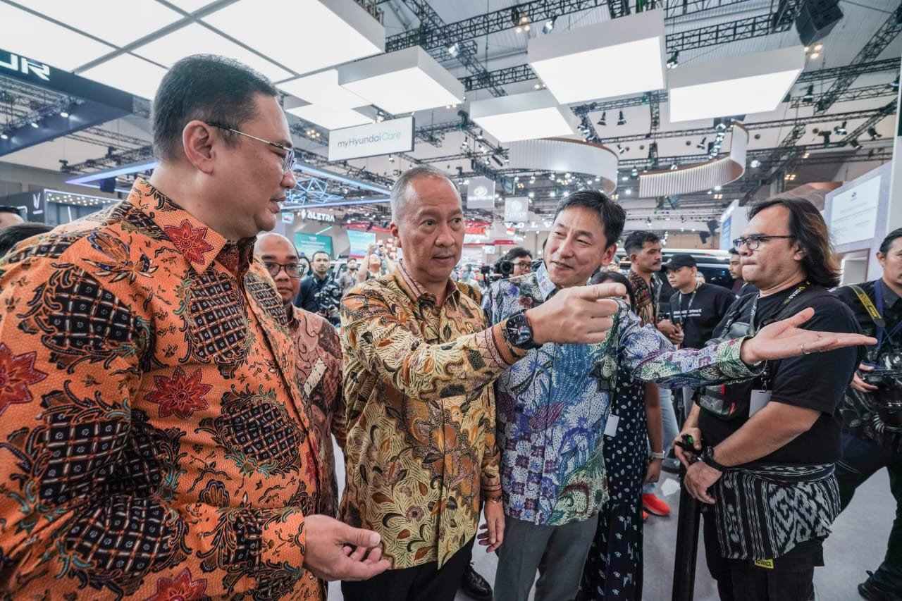 Keterangan Foto : (ki-ka) Fransiscus Soerjopranoto selaku Chief Operating Officer Hyundai Motors Indonesia, Setia Diarta selaku Direktur Jenderal Industri Logam, Mesin, Alat Transportasi, dan Elektronika (ILMATE) Kementerian Perindustrian, Agus Gumiwang Kartasasmita selaku Menteri Perindustrian Republik Indonesia, dan Ju Hun Lee selaku President Director Hyundai Motors Indonesia dalam kunjungannya ke booth Hyundai pada GIIAS 2025.