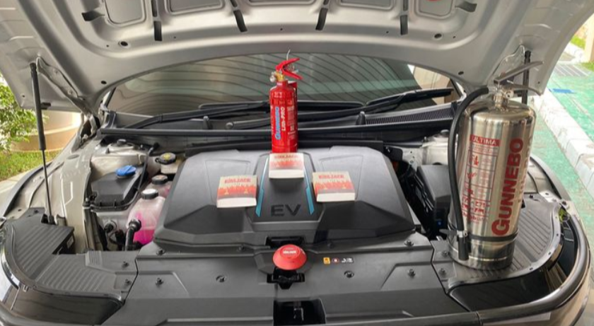Pada mobil listrik jika terjadi kebakaran pada baterainya ternyata tidak bisa dipadamkan oleh APAR biasa.