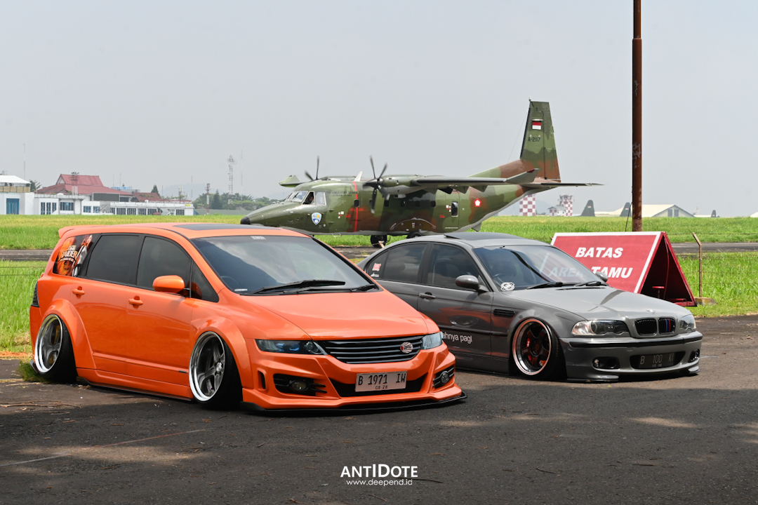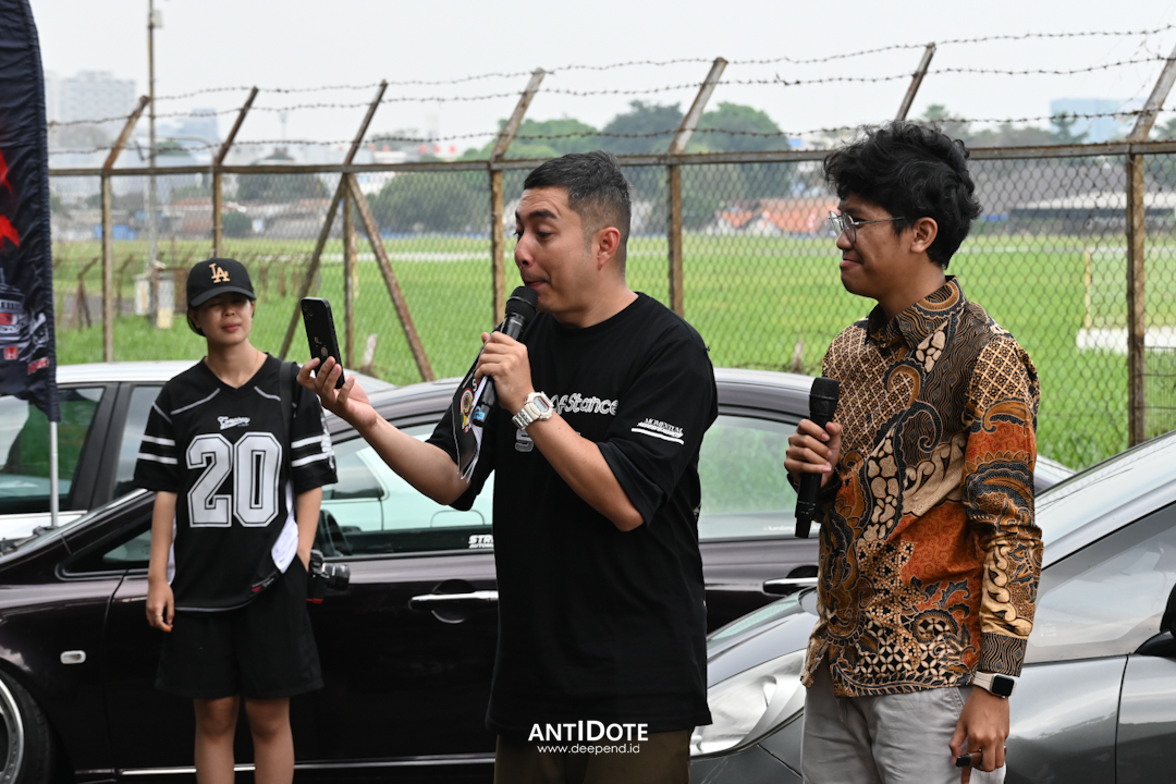 Sesampainya di lokasi, panitia mengarahkan setiap mobil ke spot yang sudah ditentukan. Formasi parkirnya rapi, menciptakan kesan layaknya ruang kelas otomotif di area terbuka. Latar belakangnya cakep: pagar runway dengan sesekali pesawat melintas untuk lepas landas atau mendarat, kontras yang keren antara dunia aviasi dan kultur modifikasi stance.