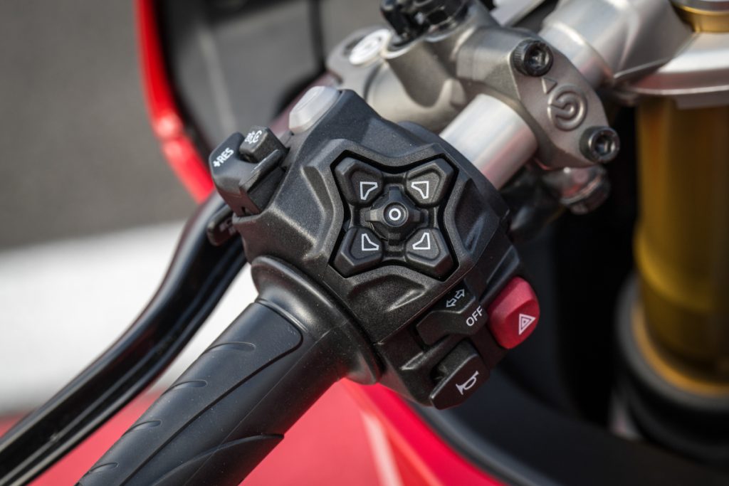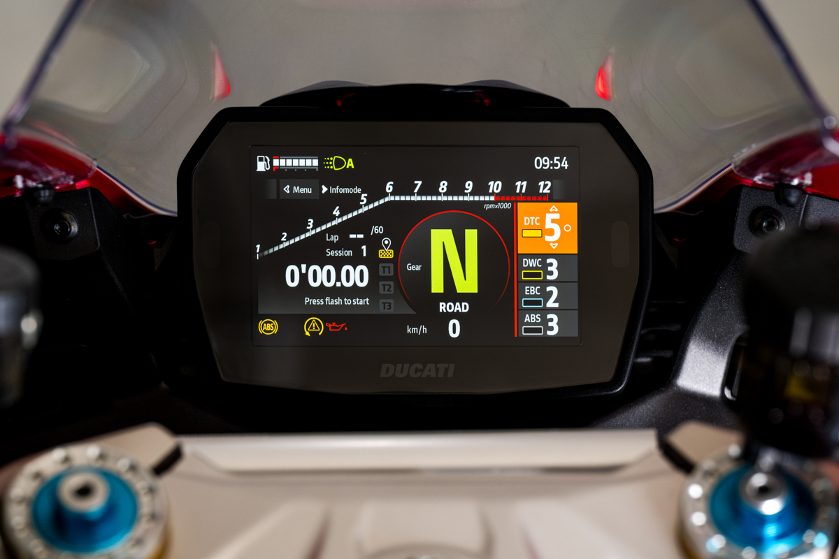 - Unit pengukuran inersia (IMU) enam-paksi menyokong elektronik termaju (Cornering ABS, DTC, DWC, EBC dan Quick Shift 2.0) yang dikawal melalui empat Mod Menunggang dan dipaparkan melalui skrin TFT 5” baharu dengan antara muka terinspirasi daripada perlumbaan.