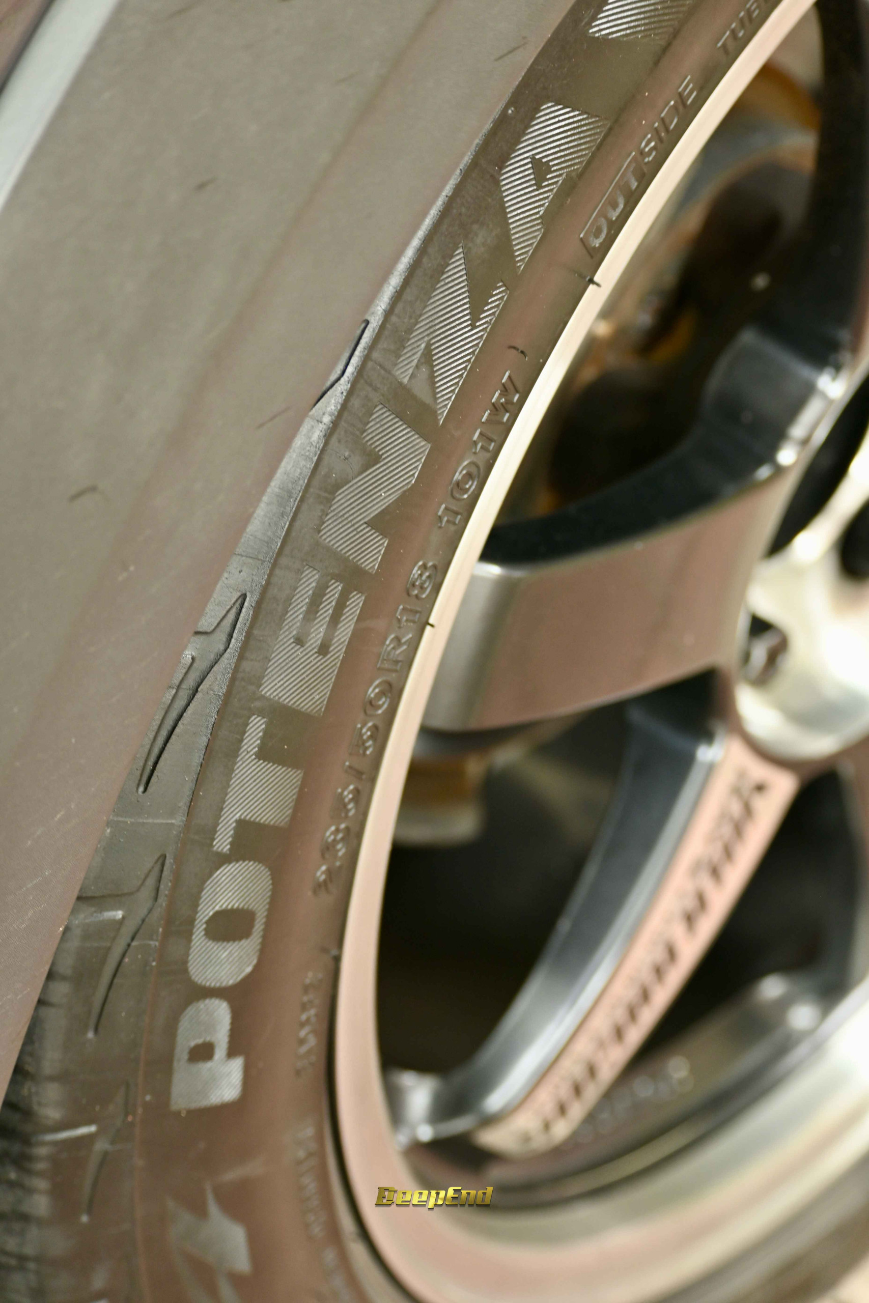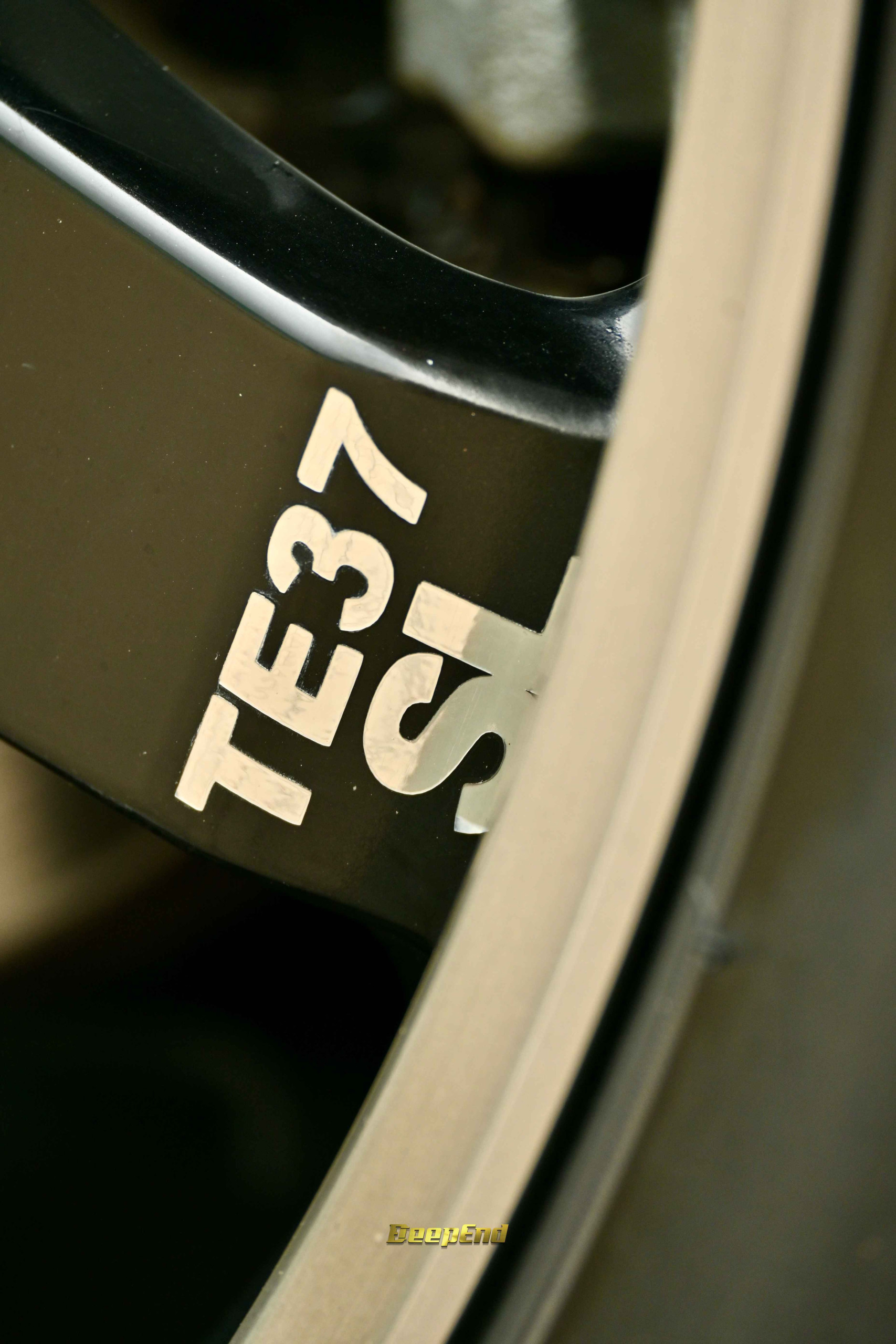 Velg Volk Racing TE37 SL 18 inci dengan ban Bridgestone Potenza Adrenalin, didukung coilover BC Racing V1 dan antiroll bar Cusco, menghasilkan pengendalian presisi tapi tetap bersahabat di jalan yang kurang mulus.