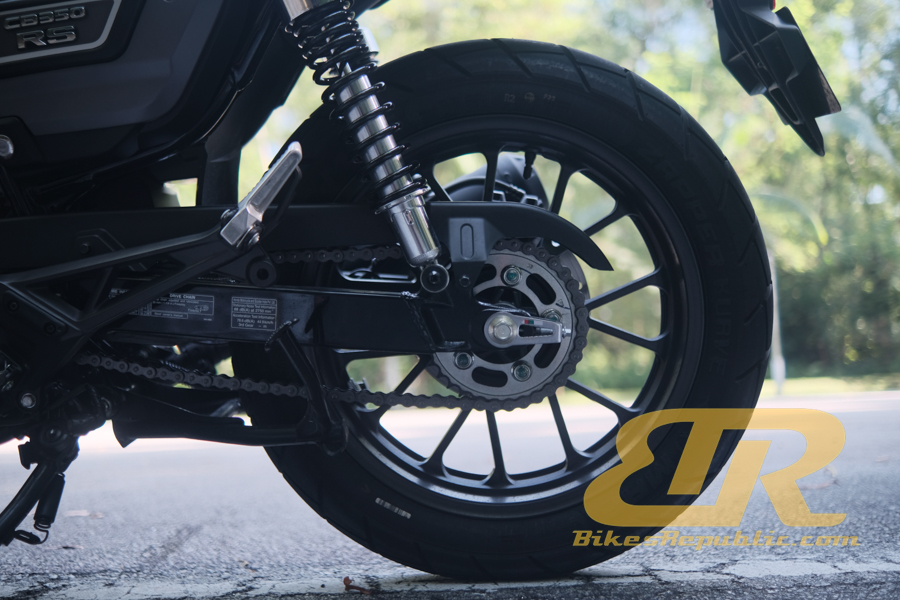 - Front suspension consists of non-adjustable telescopic forks, while a pair of shock absorbers are at the back.