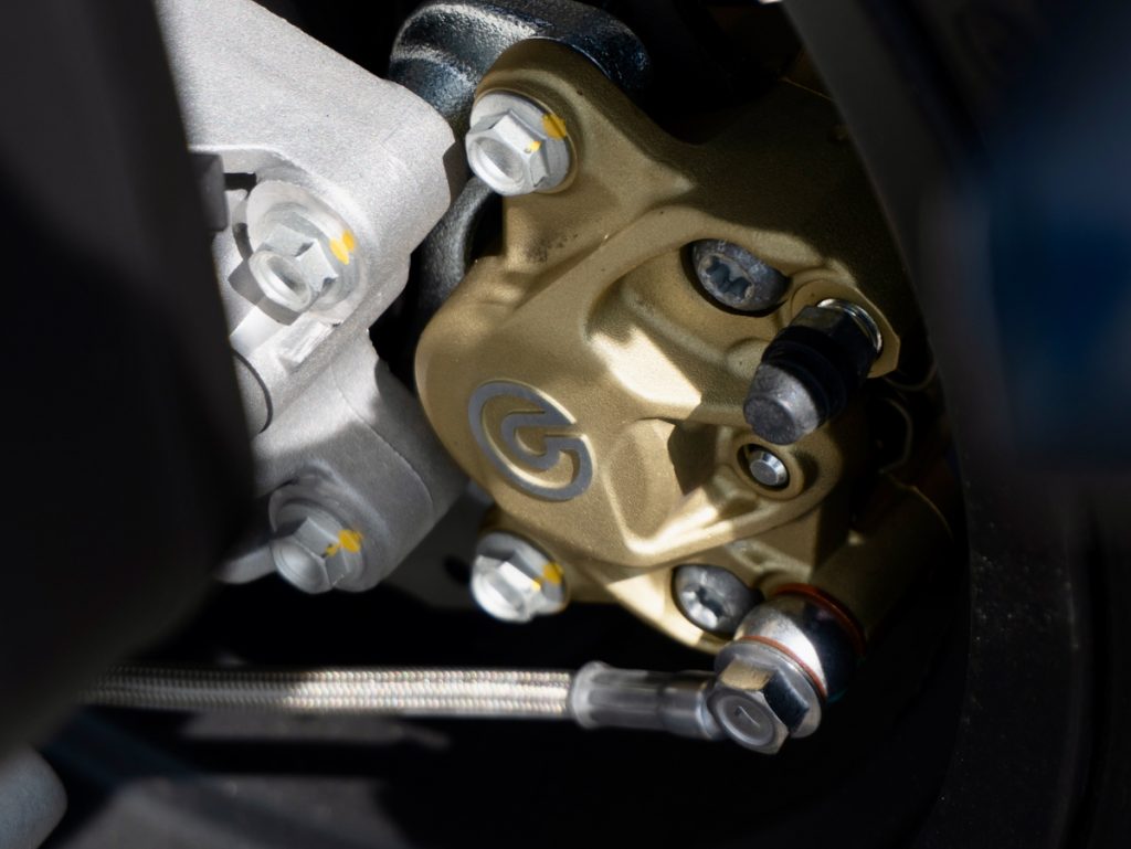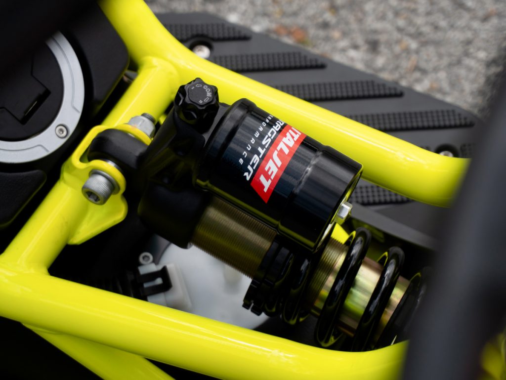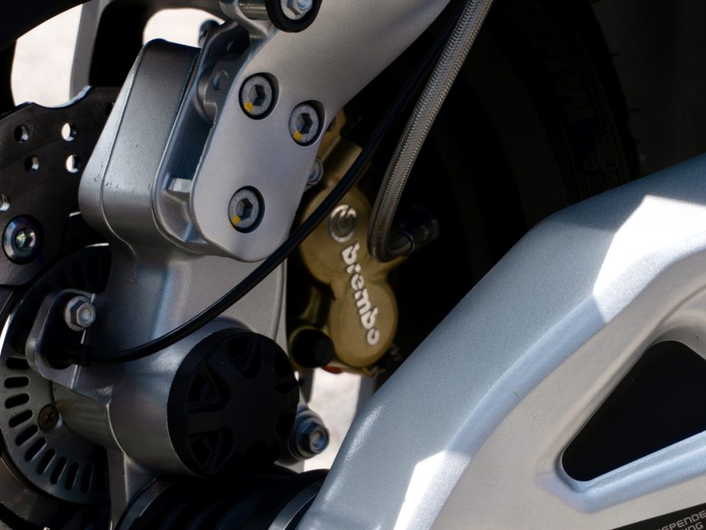 - Lightweight steel trellis frame with the Independent Steering System (ISS) centre-hub, single-sided swingarm steering system.