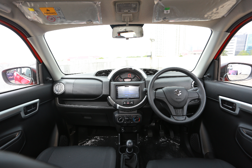 Masuk ke kabin Suzuki S-Presso, untuk mencari posisi duduk sangat mudah karena kaca depan cukup lebar, walau pengaturan posisi duduk masih manual.