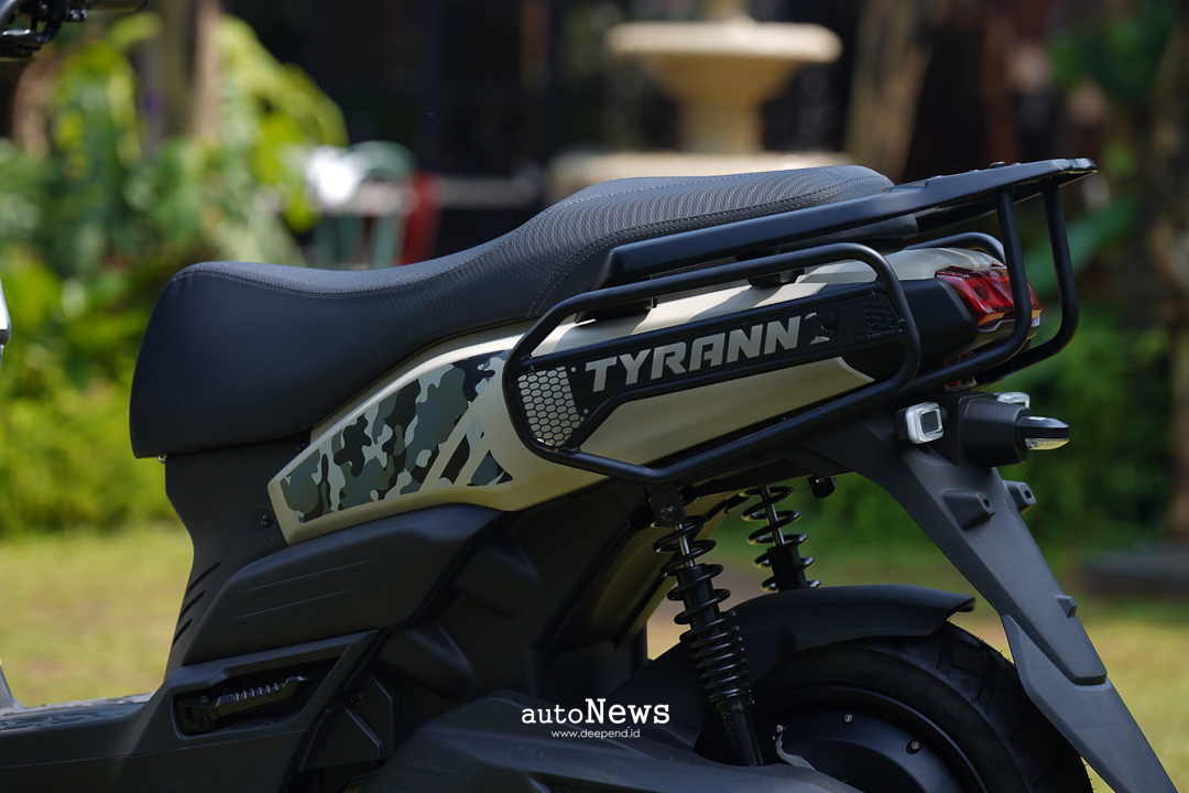 Tyranno ditenagai baterai lithium 2,45 kWh yang memungkinkan jarak tempuh hingga 110 km* dalam sekali charge. Jadi, cocok banget buat DeepEnder yang aktif di kota tapi juga doyan touring ringan. Ukurannya pun pas buat postur rata-rata orang Indonesia, jadi nyaman dikendarai sehari-hari.