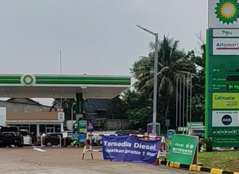 Menariknya, di depan SPBU terpampang papan bertuliskan 'Tersedia Diesel. Dapatkan Gratis 1 Liter'.