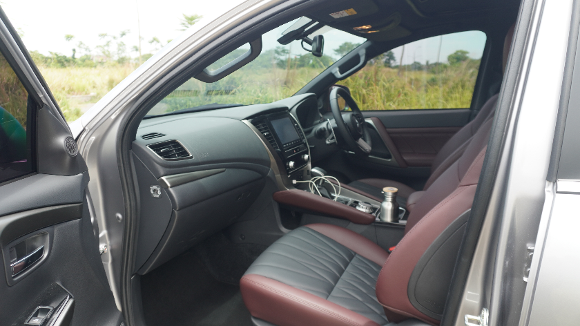 Dan memang saat masuk ke dalam kabin New Pajero, kami langsung disapa dengan aura kemewahan. Hal itu terpancar dari warna interior barunya yang didominasi hitam dan burgundy.