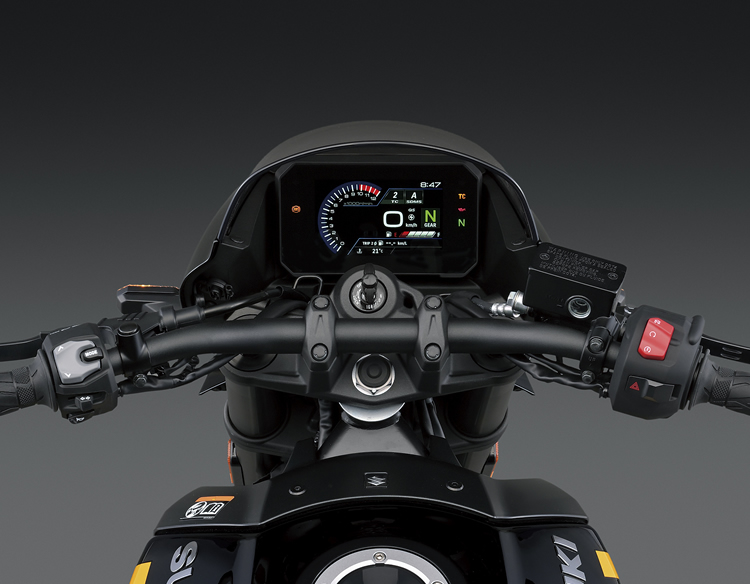 - Ride-by-wire throttle allows for 3 Suzuki Drive Mode Selector SDMS) riding modes, and 3 levels of Suzuki Traction Control System (STCS), which can be switched off.