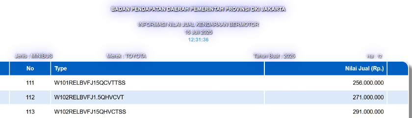 Tampak pada website Samsat DKI Jakarta tersebut, ada dua kode yang diduga adalah Toyota Veloz Hybrid.