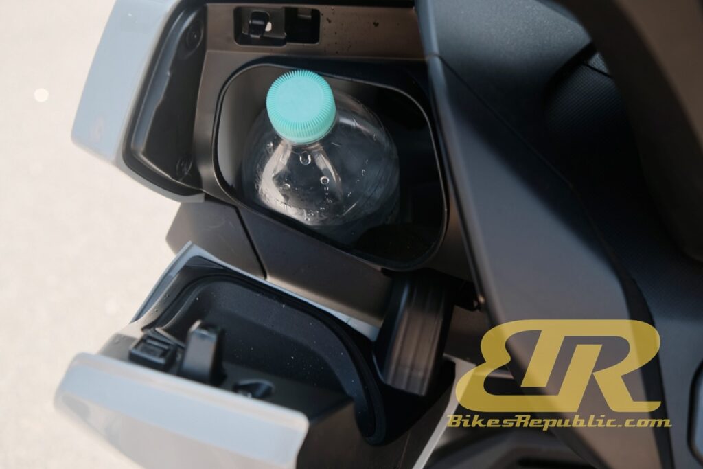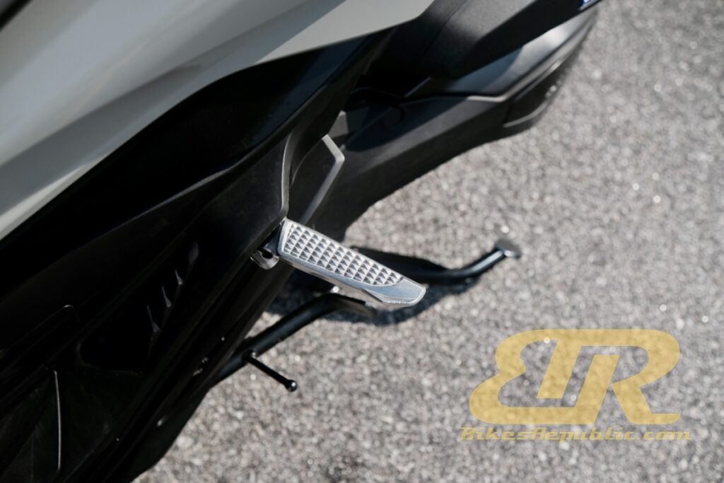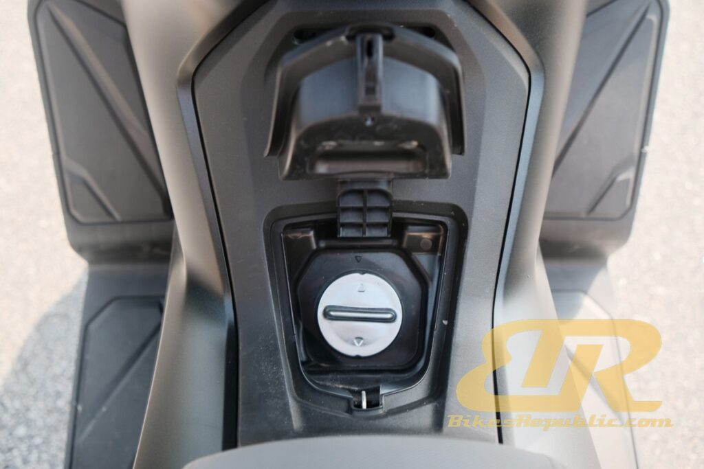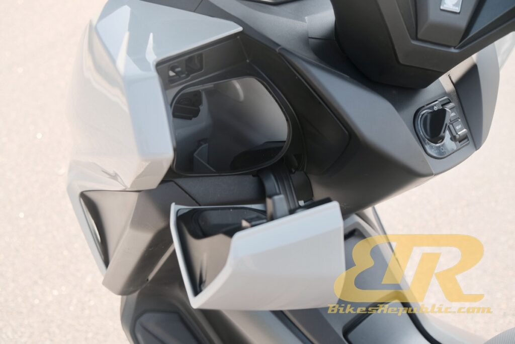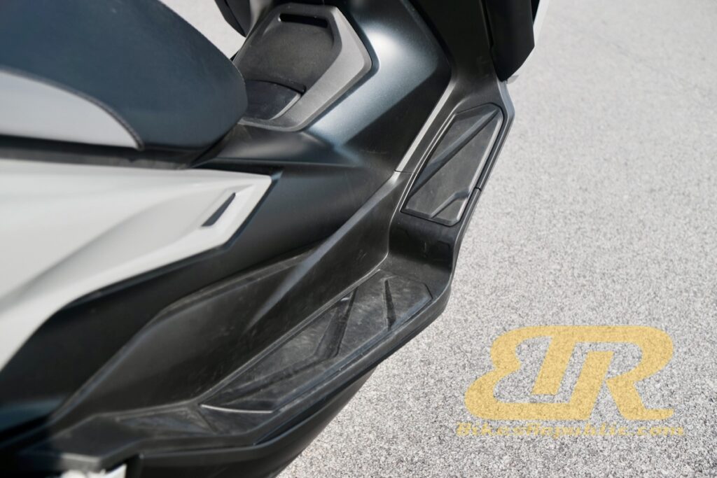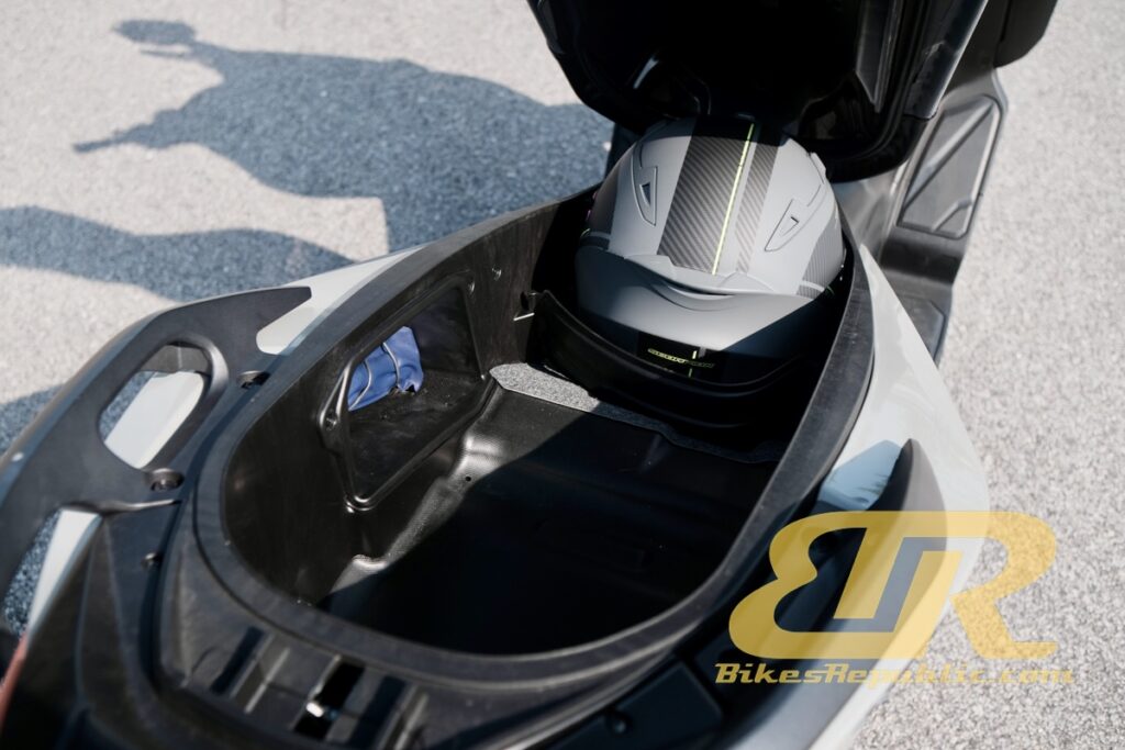 Kami amat menggemari ruang simpanan bawah tempat duduk yang besar itu. Kami boleh menyimpan topi keledar jenis jet, ditambah dengan beg beras 10kg dan barangan runcit. Kotak simpanan depan pula memuatkan sebotol air 1.5 liter. Sudah tidak perlu untuk memasang kotak Givi pada motosikal ini.