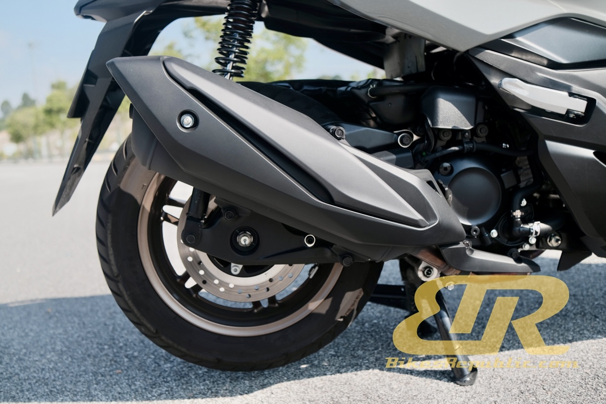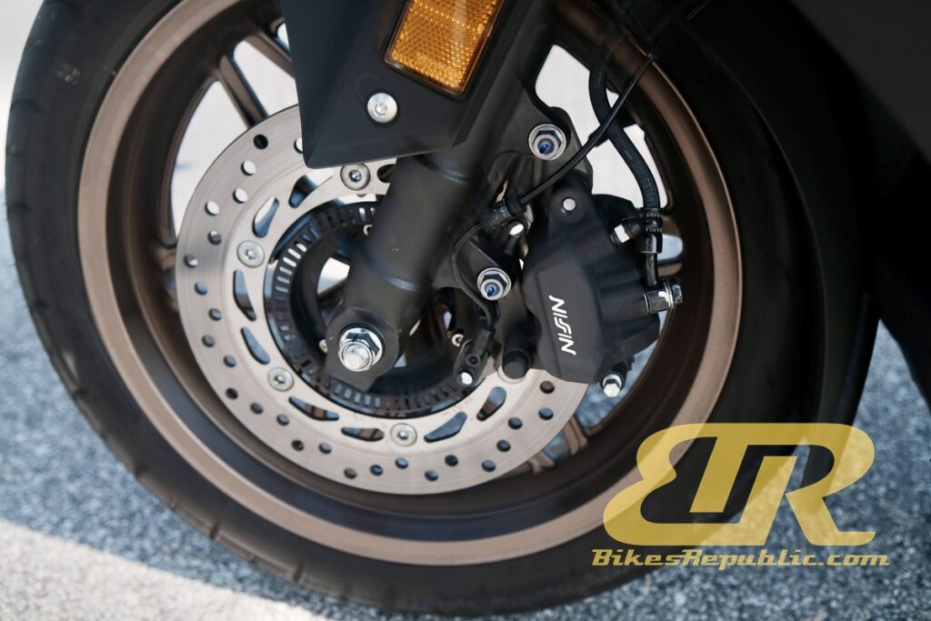 Seterusnya ialah mengenai brek. Kaliper dan silinder induk adalah daripada Nissin dan memberikan jumlah kuasa henti yang amat kuat apabila anda memerlukannya. Terdapat juga perasaan yang baik pada tuil brek, oleh itu ia memberitahu anda berapa banyak brek yang anda boleh gunakan. Malah ialah lebih baik daripada daripada sesetangah motosikal besar. Oleh yang demikian, kami siap membrek ke dalam selekoh dengan teknik ‘trail braking‘ yang seharusnya berbahaya dibuat di atas sebuah skuter.
