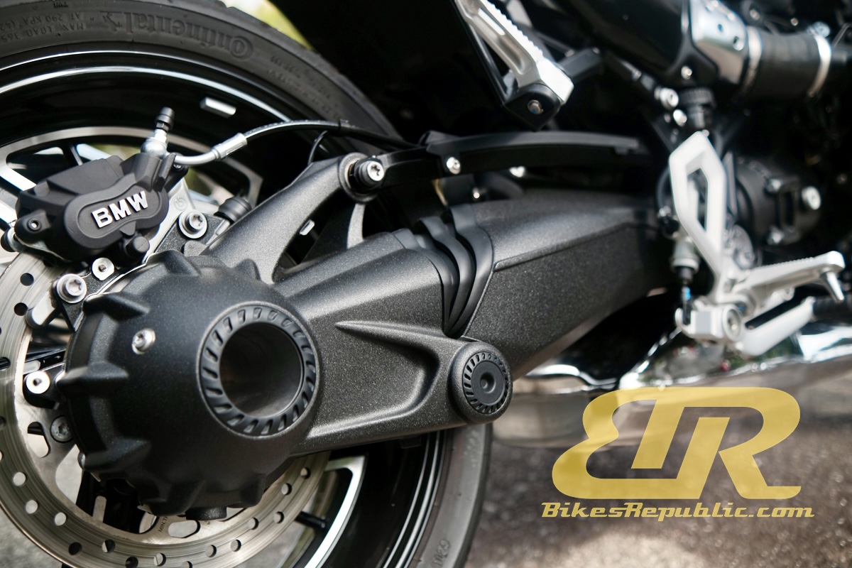 - Seperti semua model berenjin Boxer BMW, R 12 nineT menggunakan lengan ayun Paralever sebelah, tetapi kini lebih kukuh.
