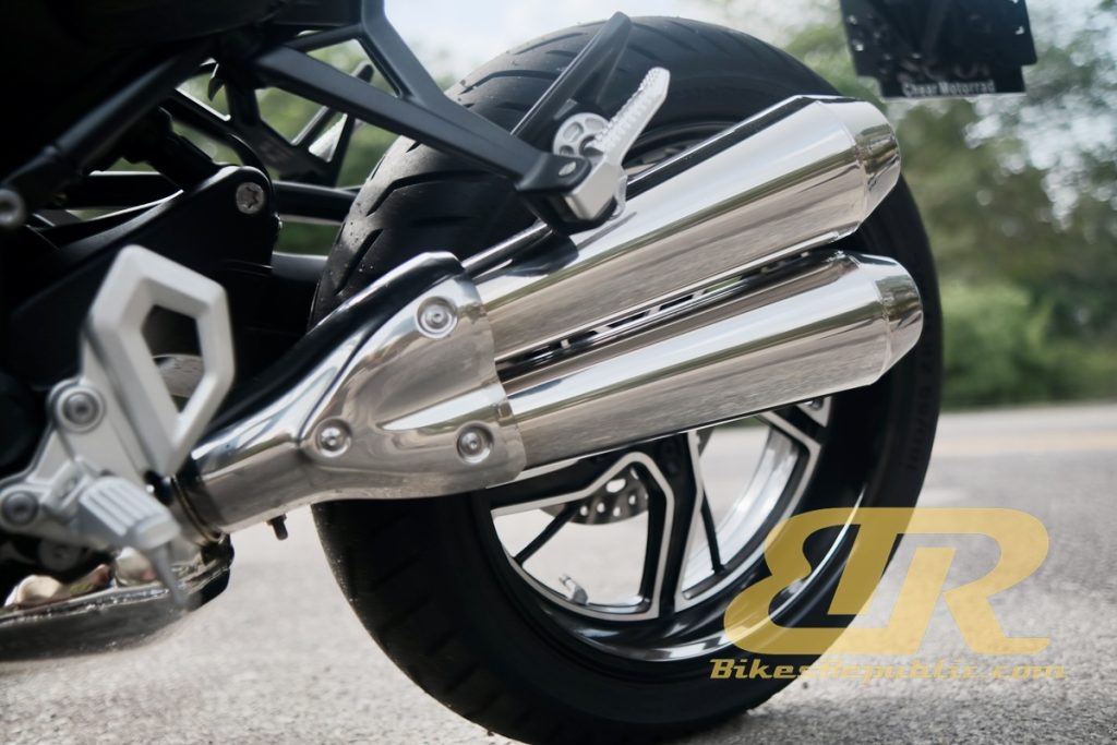 Roda motosikal ujian kami adalah tuangan aluminium, berbeza dengan roda jejari dawai dalam gambar rasmi BMW. Roda belakang menarik banyak perhatian, kerana kelihatan seperti shuriken.