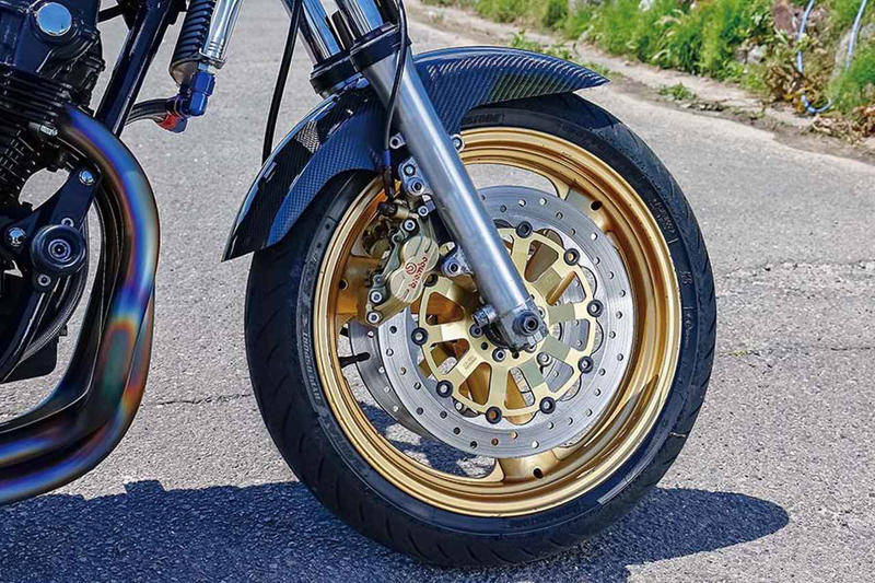 Φ43mmのフロントフォークはXJR1200純正でフォークスプリングレートを0.85Kg/mmに変更して使う。フロントブレーキはブレンボ・アキシャル4ピストンキャストキャリパー+サンスターディスク。