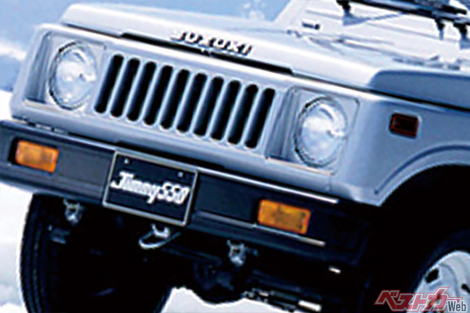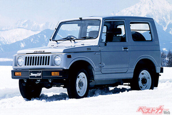 スズキ ジムニー(2代目・1981年登場)。初代からラダーフレームや副変速機付きパートタイム4WDなどを引き継ぎつつも、ふたり掛けの後部座席を設置して4人乗りに。後にEPIターボ装着モデルも登場