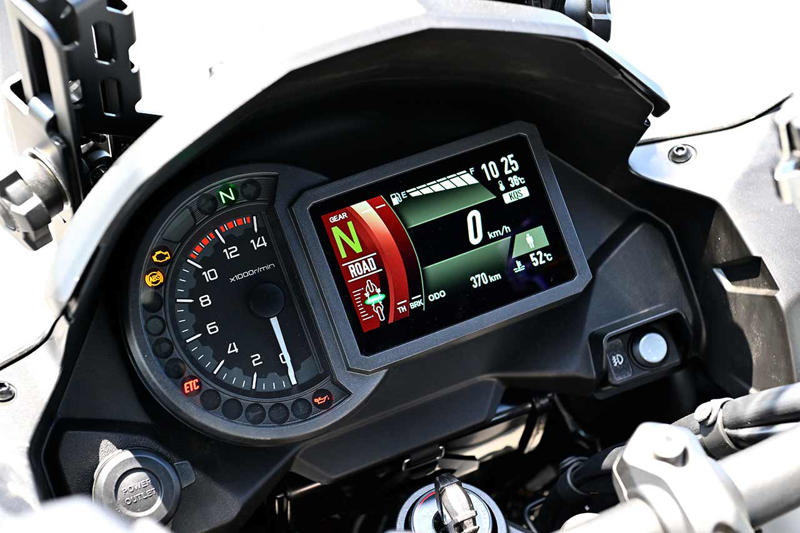 インストルメントパネルは、アナログ式のタコメーターとフルカラーTFTモニターを組み合わせたコンビネーションタイプで、視認性は良好。スマートフォン接続機能搭載で“RIDEOLOGY THE APP”に対応