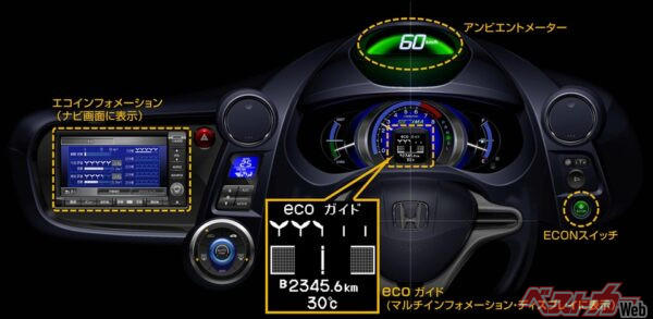 ホンダのインサイトには「エコロジカル・ドライブ・アシスト・システム」を2009年から搭載。CTVを協調制御する「ECONモード」、「コーチング機能」、「ティーチング機能」の3機能を備えた総合的なシステムは世界初とされた