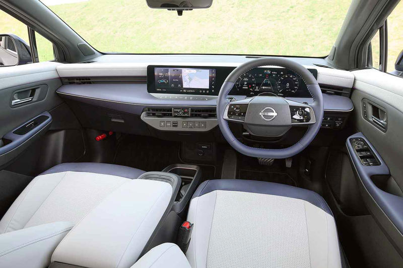 インテリアでは、CMF-EVプラットフォームの採用によりフラットなフロアと開放感のある足元空間、そして使い勝手のよいラゲッジルームを実現した。インパネは横に広がるフローティングデザインで落ち着いたミニマルな雰囲気を演出し、日産初の調光パノラミックガラスルーフ(遮熱機能付き)を搭載。