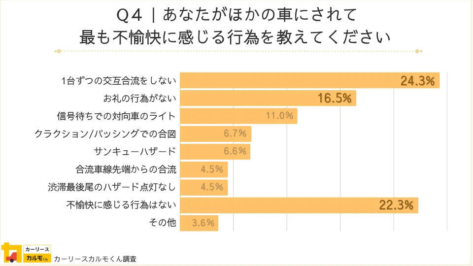 運転中にほかの車にされたら最も不愉快に感じる行為について尋ねたところ、「1台ずつの交互合流をしない」が24.3%で最多となった。理由としては「割り込みと一緒。一番効率のいい方法だけに、自分さえよければいい人と感じる」「たった1台前に入る事をそんなに嫌がる理由がわからない」「譲り合いができないのは不愉快」といった意見が並んだ。