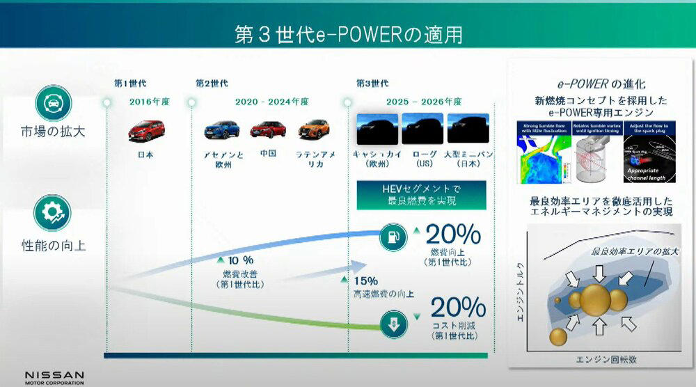 第2世代e-POWERを搭載する、現行型ノート。第3世代e-POWERでは、高速走行時の燃費が現行型比で15%改善できるという そんなe-POWERですが、日産は2025年2月13日の決算発表において、第3世代e-POWERを2025年度から2026年度にかけて、市場投入することを発表。日産によると、第3世代e-POWERは初代e-POWER比で燃費を20%向上させ、コストも20%削減。さらに、高速走行時の燃費については、第2世代e-POWER比で15%の改善を達成するとしています。
