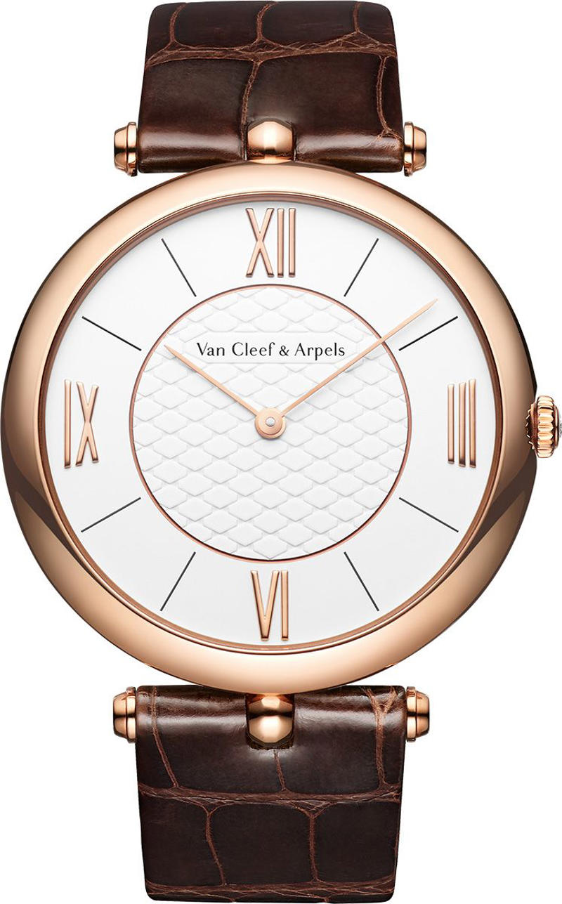 ホワイトラッカーの文字盤にはヴァン クリーフ&アーペルを象徴する“ピケ”モチーフ。リュウズトップには0.04カラットのラウンドダイヤモンドがあしらわれる。手巻き。ローズゴールド、ケース直径38mm、30m防水、パワーリザーブ57時間。237万6000円。ホワイトゴールド・ケースのモデル(252万1200円)もラインアップしている。