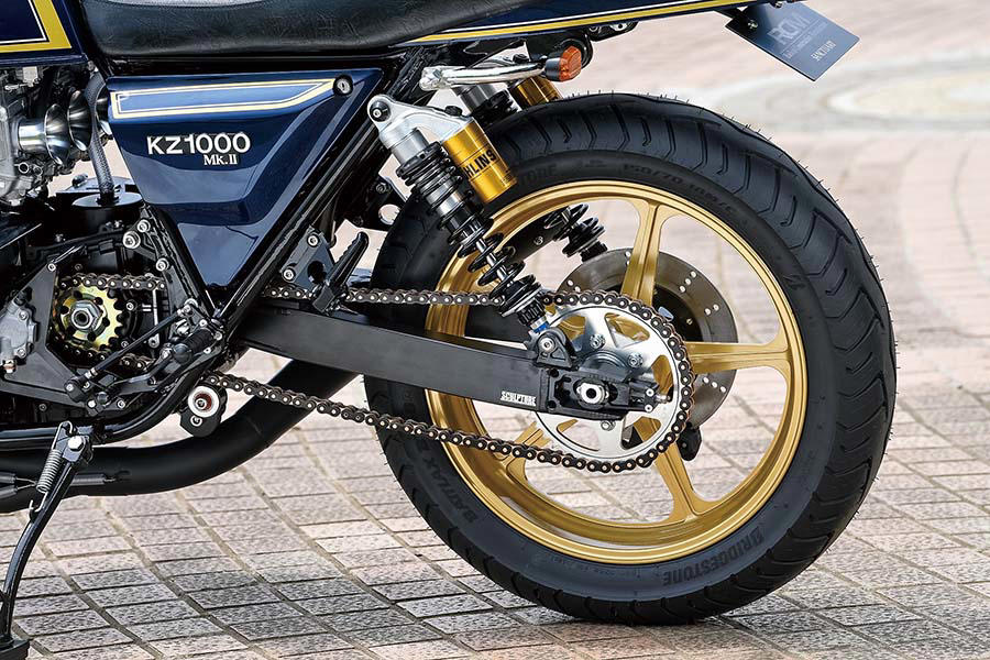 前後ホイールはアルミ鍛造のPMCソード・ヘリテイジで純正1.85-19/2.15-18から2.75-18/4.00-18サイズに変更しチェーンラインは純正85mmから91mmに8mmオフセットされる。ドライブチェーンはEK530RCMのBK;GPだ。