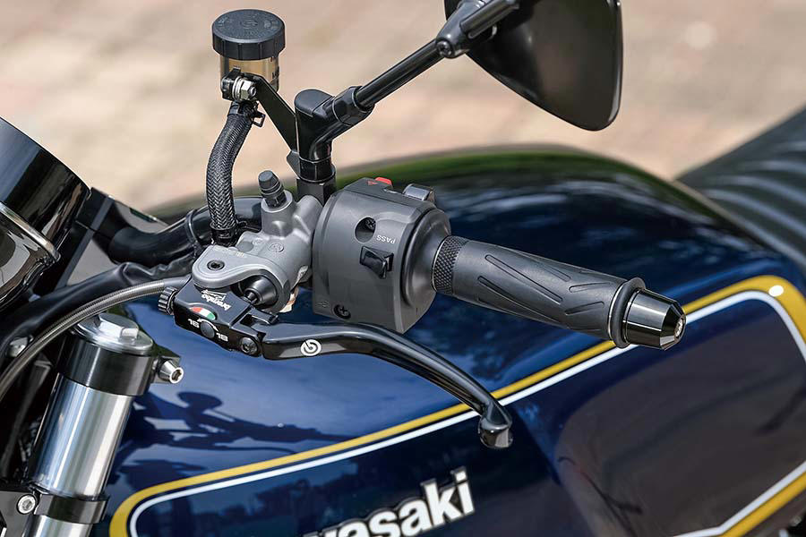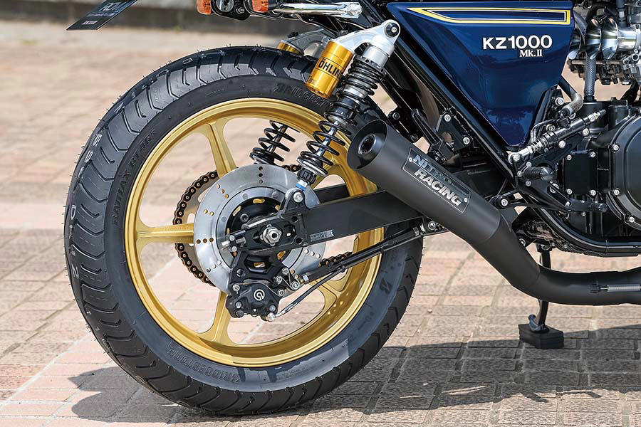 角型デザインの純正外装に載せられるZ1000Mk.II純正濃紺のカラーは、奥進がペイントしたものだ。