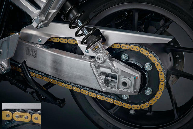 スイングアームはシルバー仕上げ。ゴールドチェーンには「プロジェクトBIG-1」ロゴ入りのコマが使用されている。