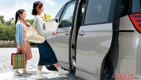 さらに、両側のスライドドアには「ハンズフリー・デュアルパワースライドドア」を採用! キーを持っている状態で、フロントドア下のセンサー部に足先をかざせば自動開閉するというスグレもの。ほら、下画像のように、荷物で両手がふさがっている時に便利!