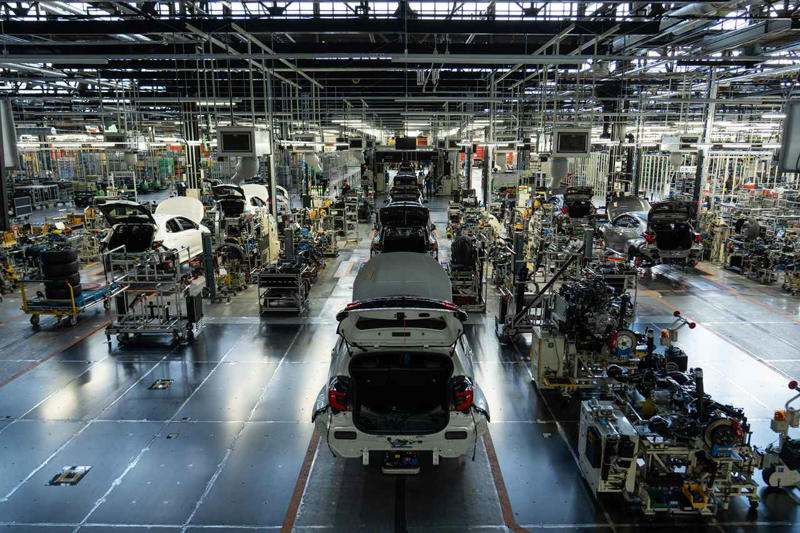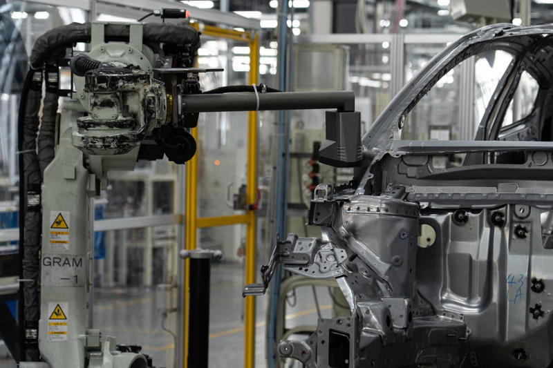 一般的な自動車工場と違ってベルトコンベアはなく、自動搬送機「AGV」でクルマを移動させる。生産台数や生産工程の変更にフレキシブルに対応できる仕組みだ。