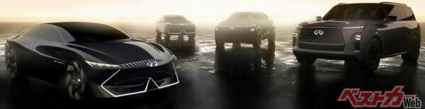 2023年10月に日産が公開したコンセプトモデルの画像。左から、ビジョンQeコンセプト、ビジョンQXeコンセプト、QX65コンセプト、そして当時デビュー間近だった新型QX80だ