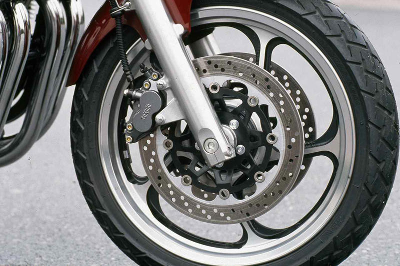 初期型のホイールは切削加工が施された美しい5本スポークのキャスト。ブレーキはΦ310mmのダブルディスクが奢られている。