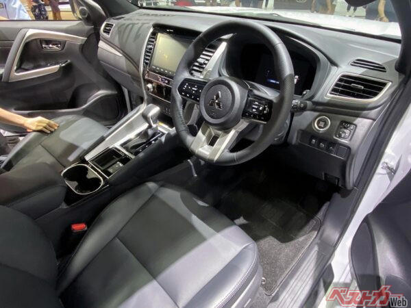 インテリアに関しては、運転席には8インチカラーLCDデジタルメーター、センターにはApple CarPlayやAndroid Auto 対応の8インチ液晶ディスプレイを装備し、ワイヤレスチャージャー、後席向けの12.1インチルーフモニターなどのデジタルデバイスが装備されているが、全体的には2015年デビューというベース車の古さは目立つ印象。シルバーメッキやピアノブラックの加飾や本革素材の投入も最小限で、「質実剛健」ともいえるが、アウトランダーPHEVに代表される昨今の三菱車のインテリアと比べて、少々寂しく感じた。