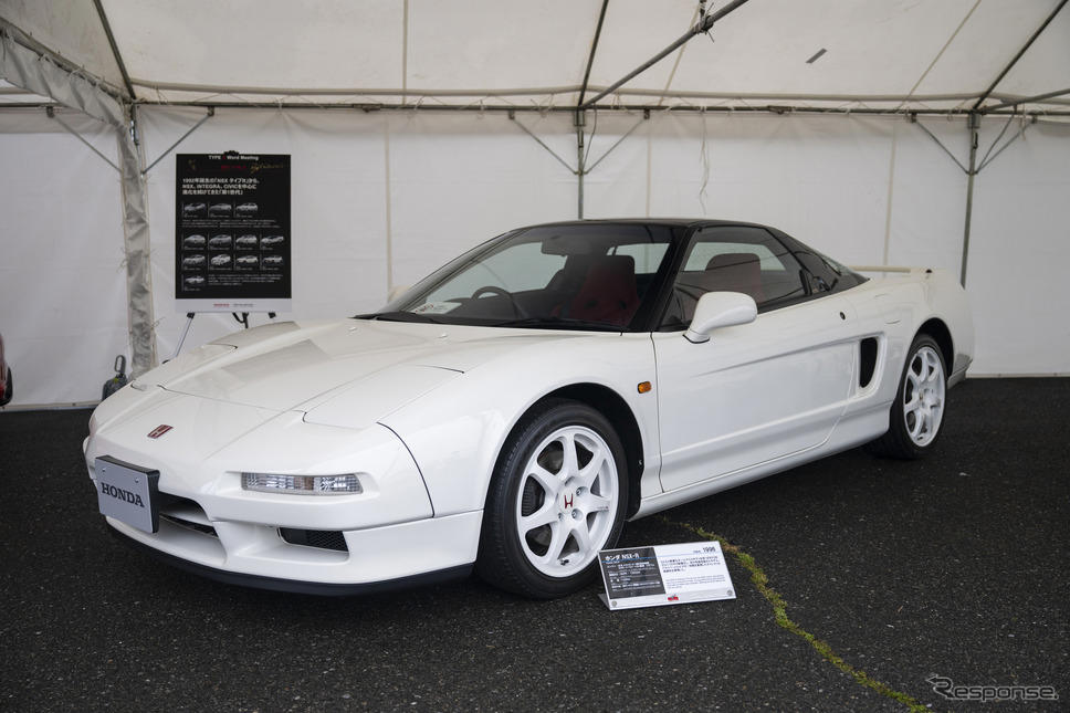その隣には、国内販売台数464台という激レアモデルのNSXタイプRが。新車当時、「NSX-R」という表記も使われたが、これこそタイプRの元祖だ。120kgもの軽量化と足回りの強化、バランス取りしたエンジンといったチューニング手法は、のちのタイプRの基礎を作ったといえる。展示車両は1996年型で、3.0リットルV6を積むNA1に、フロント16インチ/リア17インチのホイールを履く仕様。この貴重な2台をホンダコレクションホールから屋外へ持ち出し、手の届きそうな距離で見せるあたり、このイベントとタイプRファンに対するホンダの思いの強さが表れていた。