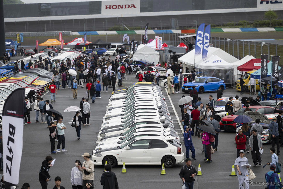 エントリー台数は、昨年を100台以上も上回る552台。これまでも会場として使用されてきた第2パドックでは収まらず、今年は第1パドックにも参加車両が並び、タイプR人気の高さを印象付けた。300台以上を占めたのは、FL5こと現行『シビックタイプR』。しかし、歴代『シビック』や『インテグラ』『NSX』も姿を見せ、オールタイプRというタイトルどおりの様相は圧巻のひとことだった。