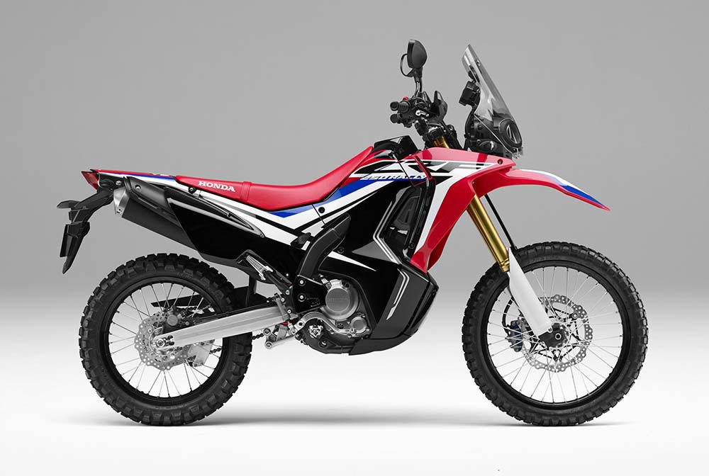 オフロードモデルのCRF250Lをベースに、ダカールラリーで活躍するCRF450RALLYをイメージしたアドベンチャーモデル。前21インチ、後18インチのホイールサイズと高い最低地上高をもち、オフロード性能はアドベンチャーとしてはピカイチ。小排気量ということもあり、これならばどんな林道でも恐れずに入っていくことができます。前後サスペンションの長いタイプもラインナップしています。