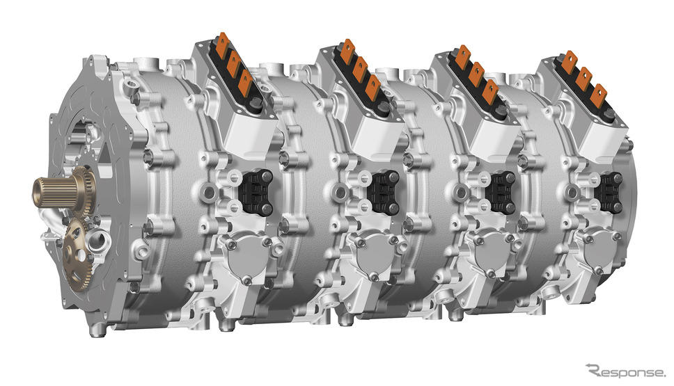 ハイブリッド航空機や電動船舶用に開発中の高出力モーターも出展する。連結して使用できることが特長で、4連結で2MW(1基あたり500kW)の出力になる。組合せによって多種類の出力帯に対応でき、さまざまな業界の電動化を可能にする。油密構造の油冷を採用し、高定格出力を実現している。