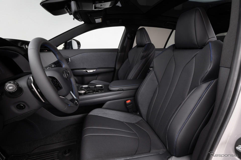 RZ 550e F SPORT AWDの内装は、このグレード専用のブルーステッチアクセントを施した黒のウルトラスエード内装トリムを特徴としている。マイクロジオメトリックパターンデザインのセンターコンソール、フロントF SPORTスカッフプレート、F SPORTエンブレム付きステアリングホイール、アルミニウムペダルとフットレストなど、スポーティな運転体験を創出するデザインとなっている。