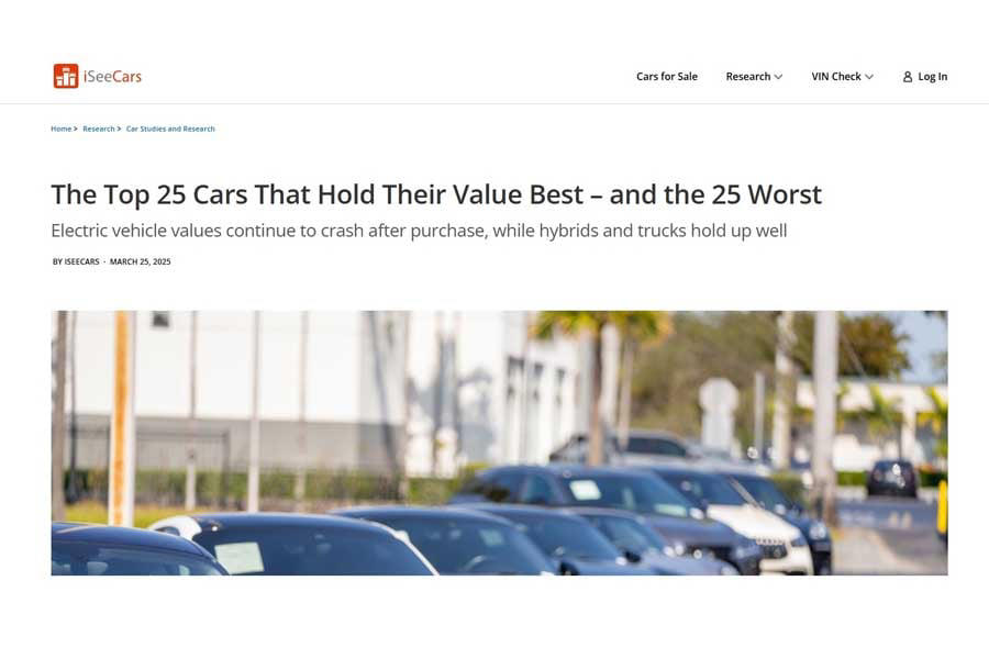リポート「The Top 25 Cars That Hold Their Value Best - and the 25 Worst(価値が最も維持されるトップ25の車 - そしてワースト25)」(画像:iSeeCars)